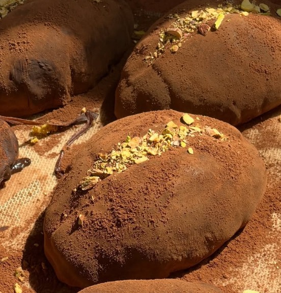 Bayangkan sebuah Salt Bread yang punya tekstur kenyal dan rasa gurih mentega, tapi bagian dalamnya diisi dengan campuran kunafa renyah dan pistachio yang melimpah (khas Dubai Chocolate). Nggak berhenti di situ, seluruh bagian rotinya dibalut lagi dengan adonan chewy chocolate cookie yang legit. Sebagai finishing touch, bagian atasnya diberi taburan cincangan pistachio hijau yang cantik.